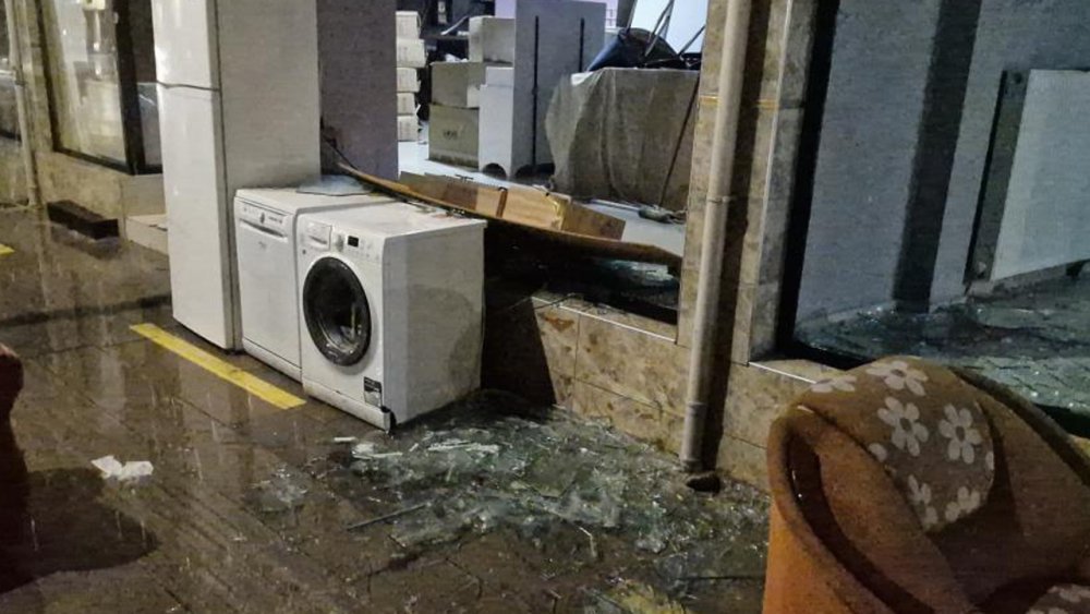 Aynı bölgede bulunan bir iş yerinin yaklaşık 4 metre uzunluğundaki camları ise rüzgârın oluşturduğu basınç nedeniyle patladı. Rüzgâr nedeniyle bazı çöp konteynerlerinin de devrildiği görüldü.