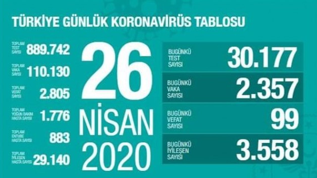 Sağlık Bakanı Fahrettin Koca tarafından açıklanan son verilere göre son 24 saatte 99 kişi daha hayatını kaybetti. Toplam vaka sayı ise 110 bin 130'a yükseldi.