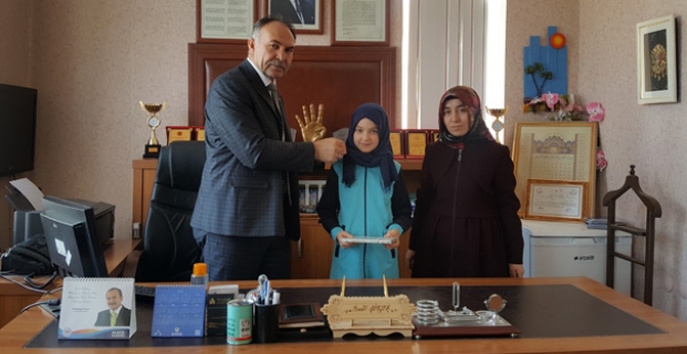 Okul Müdürü Kadir Şimsek, öğrencisi Sevde İşcen'i başarısından dolayı kutlayarak, çeyrek altınla ödüllendirdi.