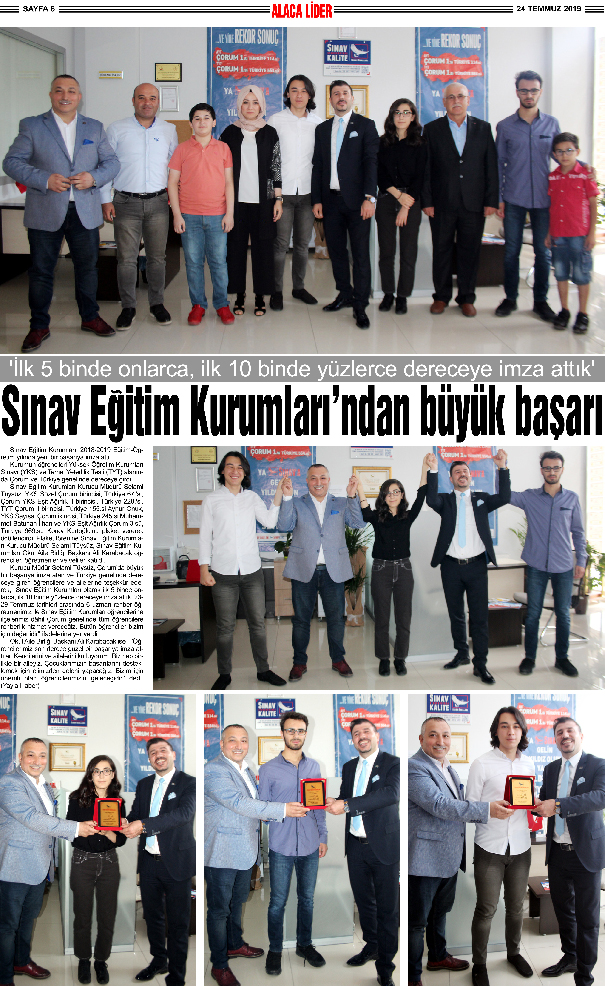 Sınav Eğitim Kurumları Kurucu Müdürü Selami Tüysüz, YKS Sözel Çorum birincisi, Türkiye 67.’si, Çorum YKS Eşit Ağırlık İl birincisi, Türkiye 220.’si, TYT Çorum İl birincisi, Türkiye 155.si Aynur Onuk, YKS Sayısal Çorum ikincisi, Türkiye 245.si Muhammet Batuhan İlhan ve YKS Eşit Ağırlık Çorum 3.sü, Türkiye 969.su Koray Kurtoğlu’nu plaket vererek ödüllendirdi. Plaket törenine Sınav Eğitim Kurumları Kurucu Müdürü Selami Tüysüz, Sınav Eğitim Kurumları Okul Aile Birliği Başkanı Ali Karabacak öğrenciler, öğretmenler ve veliler katıldı.