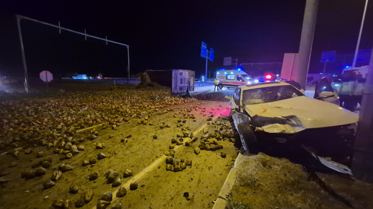 Olay, Çorum-Yozgat çevre yolu üzerindeki Zile Kavşağı’nda meydana geldi. Zile yönüne seyir eden Nursait Y. idaresindeki 34 VMV 65 plakalı otomobil, kavşakta Çorum istikametine ilerleyen Ali Oktay Ö.’nün kullandığı 66 DZ 272 plakalı tırla çarpıştı. Çarpışmanın etkisiyle tır devrilirken dorsedeki şeker pancarları yola savruldu.