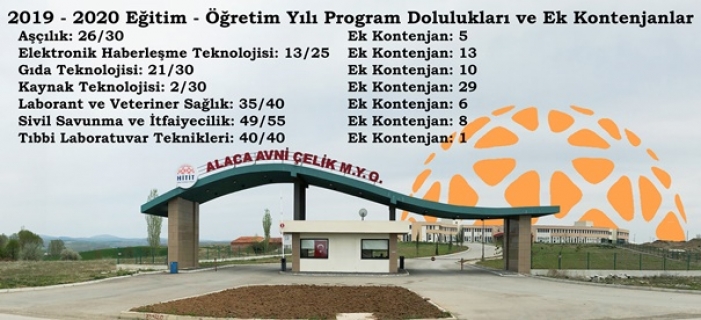 Aşçılık, Elektronik ve Haberleşme Teknolojisi, Gıda Teknolojisi, Kaynak Teknolojisi, Laborant ve Veteriner Sağlık, Sivil Savunma ve İtfaiyecilik ve Tıbbi Laboratuar Teknikleri Programları'yla toplam 7 programda 250 öğrenci kontenjanına ulaşan ve şimdiye kadarki en yüksek sayıda program kontenjanı ve yerleştirme sağlayan Alaca MYO için programlara ait ek kontenjanlar belli oldu.