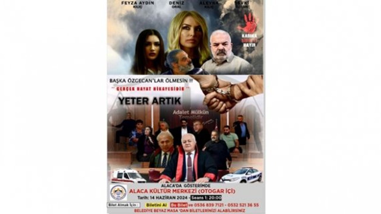 Çorum'lu hemşehrimiz Yapımcı/Yönetmen Murat Kuşçu’nun yönetmenliğinde, kadına şiddete hayır sloganıyla yola çıkılan “Yeter Artık” adlı sinema filminin Alaca Belediyesi Katkıları ile 14 Haziran 2024 tarihinde saat 20:00 Alaca Kültür merkezinde gösterimde olacağı duyuruldu.